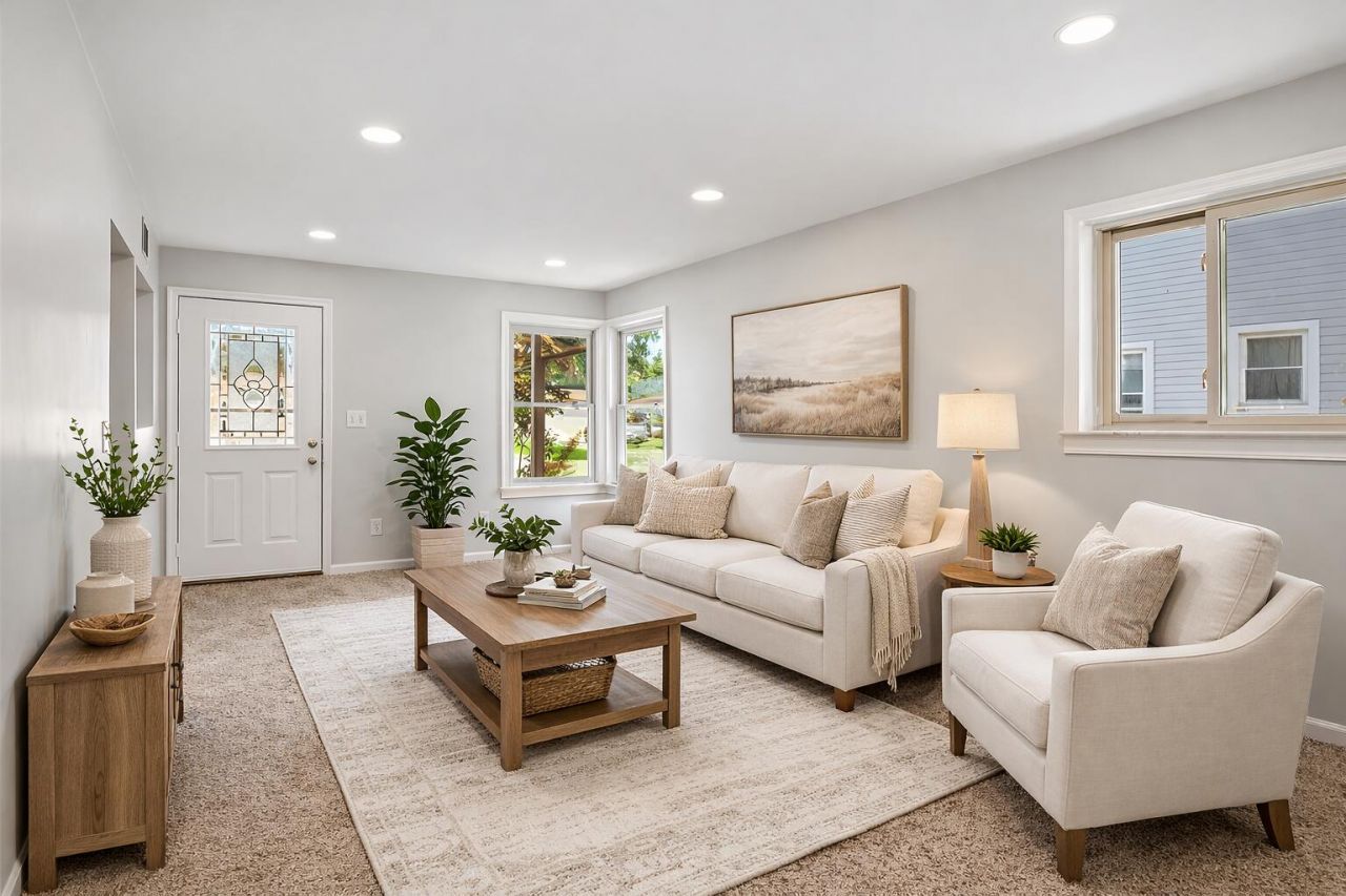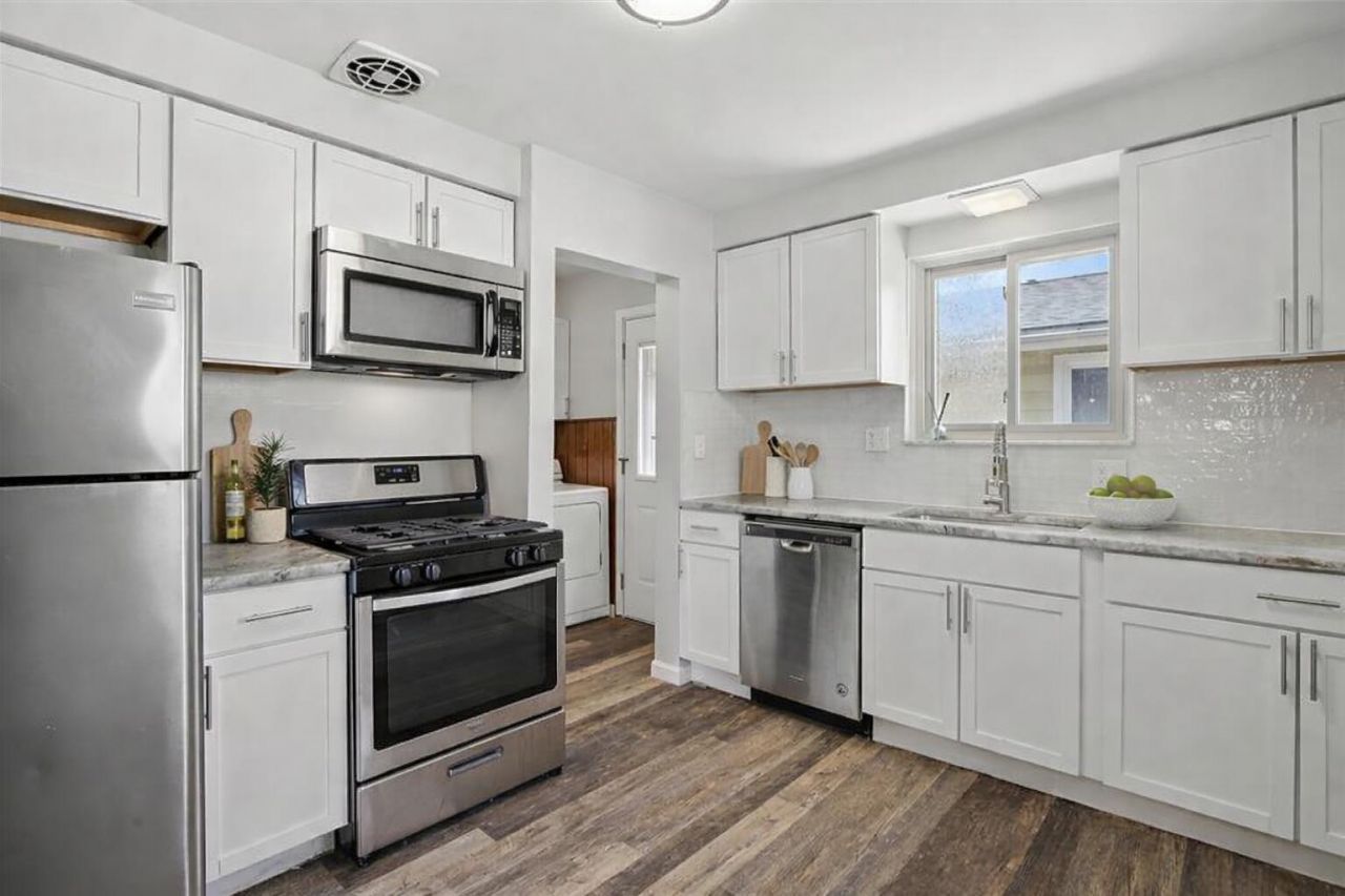 Welcome home to this beautifully updated and move-in-ready ranch offering 3 bedrooms and 1 full bath with just over 1,000 square feet of comfortable living space. Renovated in 2023, this super sharp home blends modern updates with classic charm. The stunning kitchen features white cabinetry, granite countertops, a subway tile backsplash, new flooring, and stainless steel appliances, including a refrigerator, microwave, dishwasher, washer, and dryer all included for added convenience. The spacious living room offers new carpeting and recessed lighting, creating a warm and inviting space to relax or entertain. Three generously sized bedrooms and a newly remodeled full bath complete the interior, along with convenient first-floor laundry. The home has been freshly painted throughout and features all new light fixtures along with updated mechanicals including the furnace, central air conditioning, and hot water heater. Outside, enjoy a welcoming covered front porch perfect for morning coffee or evening gatherings, a fenced yard with sidewalks, and a large 2.5-car garage with opener providing plenty of space for parking, storage, or a workshop. Ideally located close to the airport, restaurants, shopping, and expressways, this well-maintained home offers comfort, style, and a fantastic location ready for its next owner to move right in.