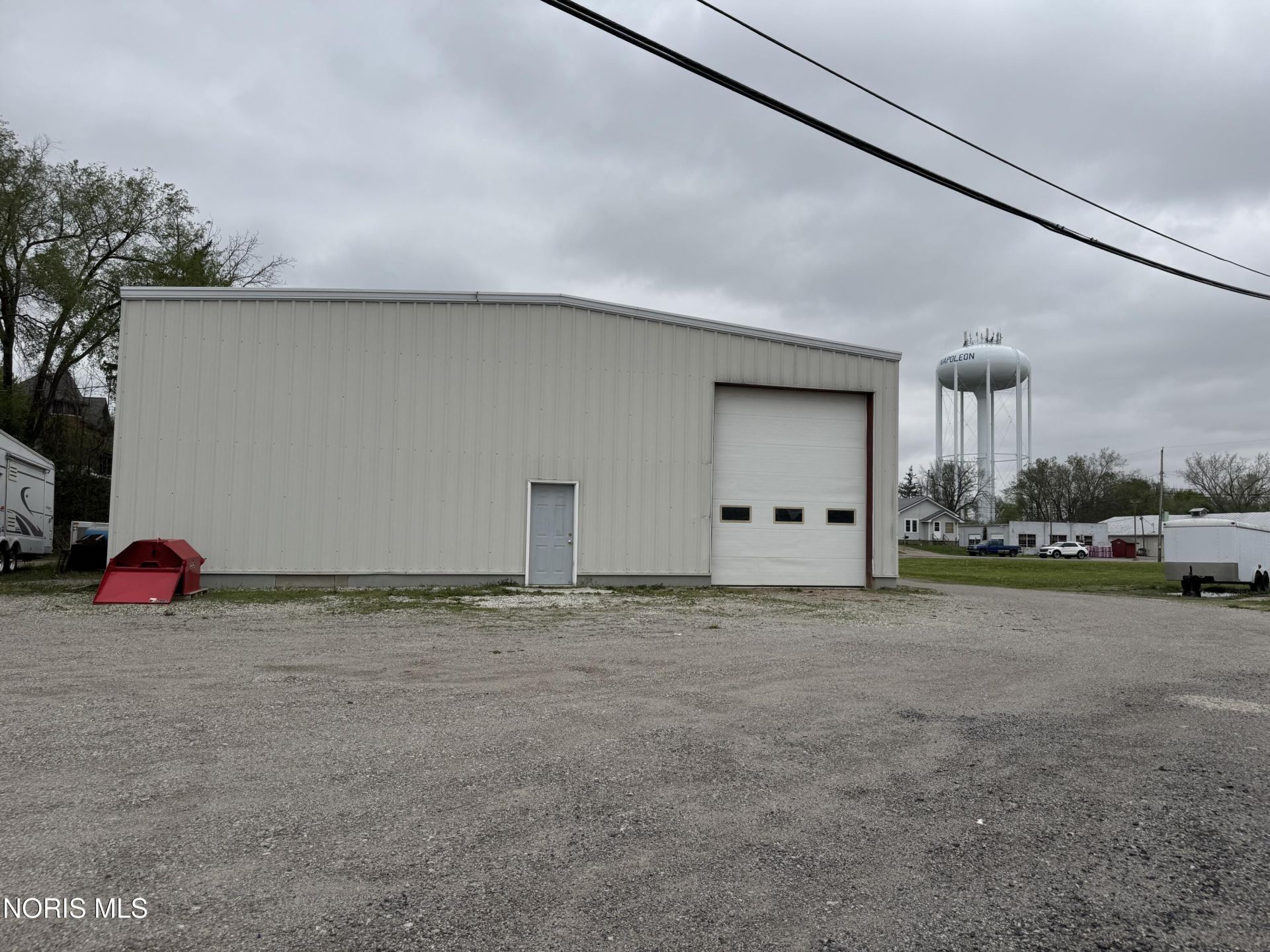 Commercial property located on a corner lot 2 blocks east of downtown Napoleon. This 50x100 steel building has an 8 concrete floor and 36 rat wall. Enclosed room has been plumbed for bathrooms and has electric baseboard heat. Ceiling is insulated. Two overhead doors with electric openers (14'w x 12'h) & (18'w x 14'h).