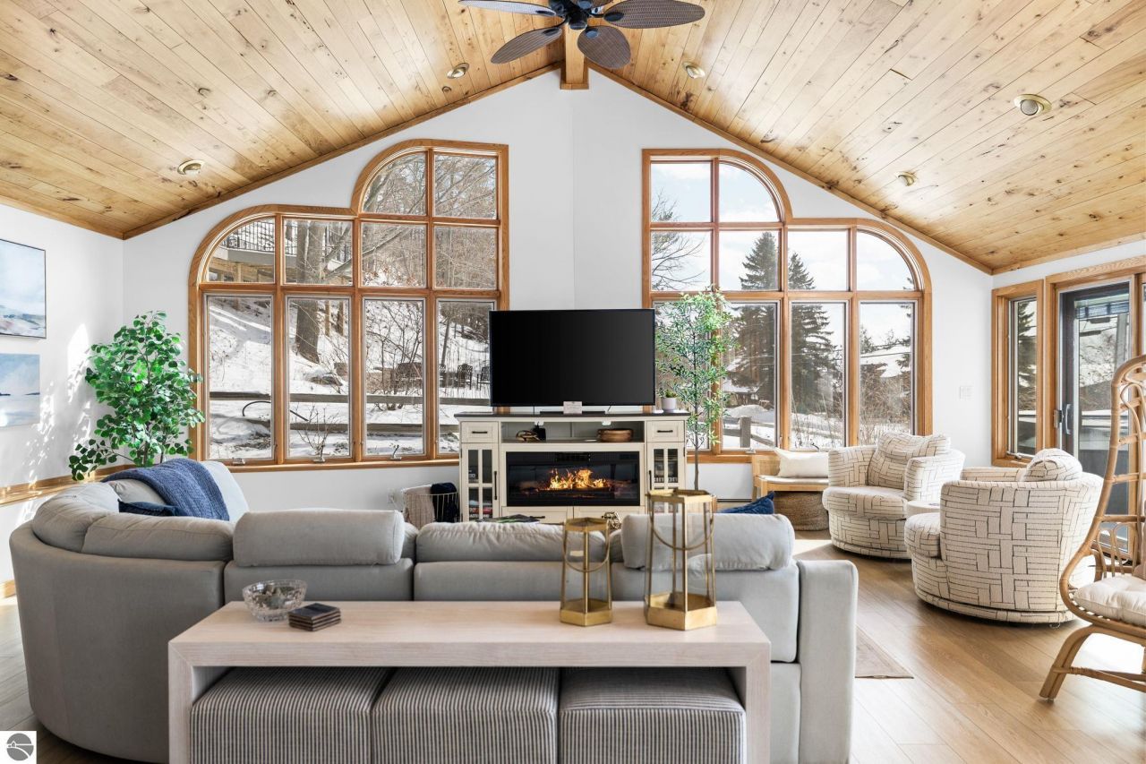 Crystal Lake living begins here, with 75 feet of private sandy frontage in one of Northern Michigan???s most sought-after locations. This waterfront property offers a rare opportunity to enjoy the beauty of Crystal Lake while holding exceptional long-term value in an unbeatable setting. The home features 6 bedrooms, 3.5 bathrooms, and over 4,200 square feet of living space, offering plenty of room to gather, relax, and take in the surrounding lake views. The layout includes a main house along with a carriage house connected by a charming boardwalk, creating a unique and flexible living arrangement. Recently updated and offered fully furnished, the home is move-in ready and designed for effortless lake living from day one. The property has also been a successful short-term rental for the past five years, offering a strong track record for those interested in continuing its use as an income-producing retreat. Outside, the property provides direct access to the clear blue waters that make Crystal Lake so well known. Spend your days swimming, boating, or simply enjoying the peaceful setting along the shoreline. A detached four-car garage includes a spacious loft with a bath above, creating additional space that may serve as guest quarters, recreation space, or storage. Crystal Lake properties like this rarely become available. With generous frontage, significant living space, and a proven rental history already in place, this property represents an exceptional opportunity to own along one of Northern Michigan???s most iconic lakes.