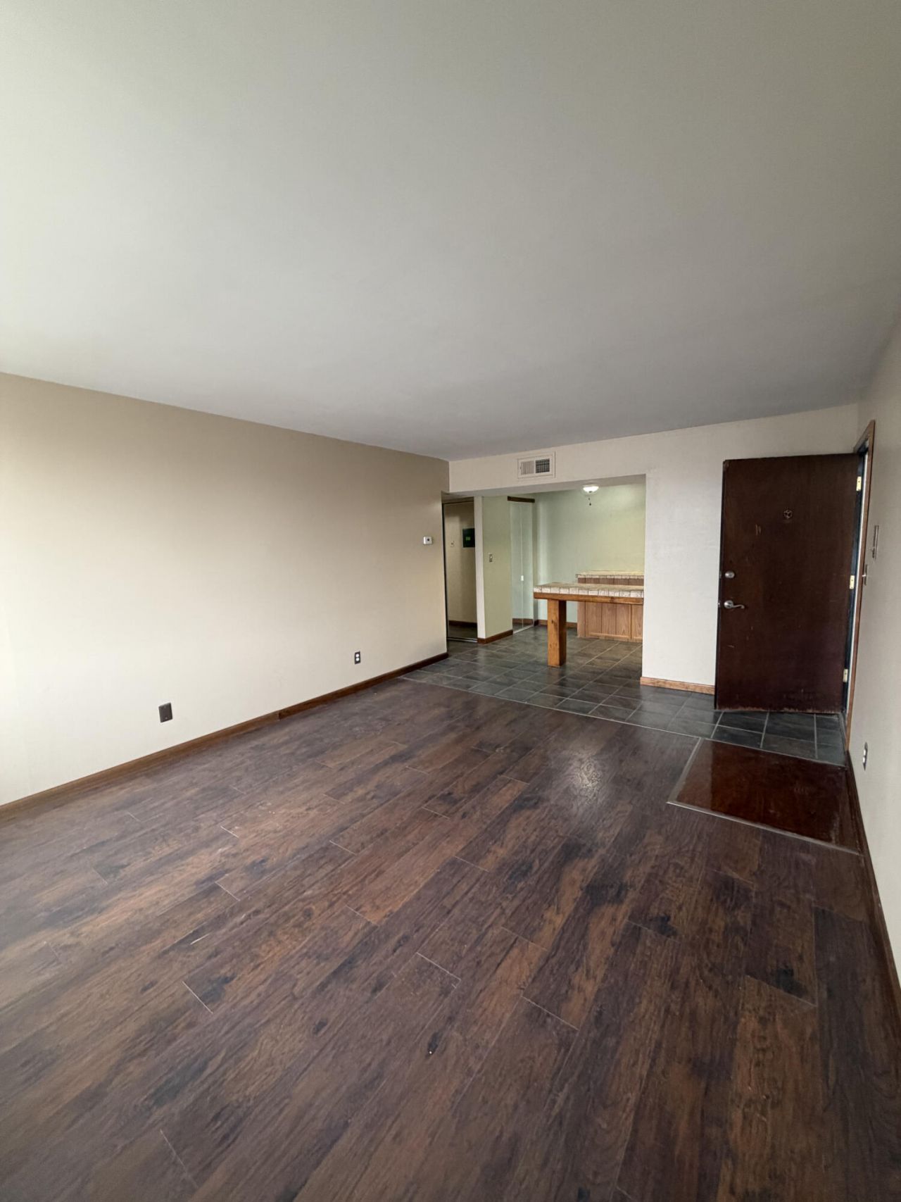 This well maintained main level ranch style condo offers 983 square feet of comfortable living space. The living room and both bedrooms feature manufactured wood flooring, while the entryway, kitchen, and hallway are finished with 12 inch ceramic tile designed to resemble slate.Additional highlights include oak interior doors and beveled glass closet doors throughout the unit. The kitchen comes fully equipped with all appliances and offers extra cabinetry for added storage, along with ceramic countertops and a matching backsplash. The full bathroom includes a tub, 12 inch ceramic tile flooring, and a Corian countertop. The primary bedroom features a generously sized walk in closet. Vertical blinds are installed on the windows throughout the condo.The basement level provides a shared laundry facility as well as a designated private storage.