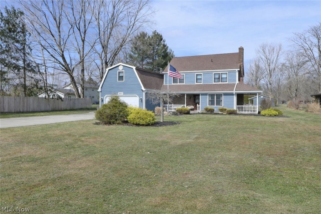 Welcome home to this spacious 5-bedroom, 4-bath front porch Colonial situated on nearly an acre in the desirable Firelands School District in South Amherst. This home features an ASSUMABLE MORTGAGE with a low 2.875% interest rate, offering buyers the opportunity for significant monthly savings. The inviting living room features a decorative fireplace and access to the covered side porch. The charming farmhouse-style kitchen is designed for both function and style with butcher block countertops, farmhouse sink, stone backsplash, a pot filler and a walk-in pantry. The dining room is open to the kitchen and showcases a vaulted wood ceiling and additional cabinetry for storage. The large family room features a vaulted, beamed ceiling and offers the perfect space for entertaining or relaxing with family and friends. From here, step into the bright three-season room with sliding doors leading to the patio and backyard. The first floor also includes a bedroom or home office with a bow window overlooking the backyard, along with a laundry room, mudroom, and a full bath. A private back staircase leads to a second floor bedroom or flex room that includes a half bath. An additional staircase off the foyer leads to three additional bedrooms, a full bath and a spacious primary suite complete with a walk-in closet and a full bath featuring a soaking tub. Additional features include an oversized attached two-car garage plus a separate two-car outbuilding, perfect for extra vehicle storage, hobbies, or workshop space. Recent updates include HVAC with humidifier (2018), water heater (2021), septic system (2024), vinyl siding (2025), gutters (2025) and garage door (2026). Conveniently located with easy access to major highways while offering a peaceful country setting.