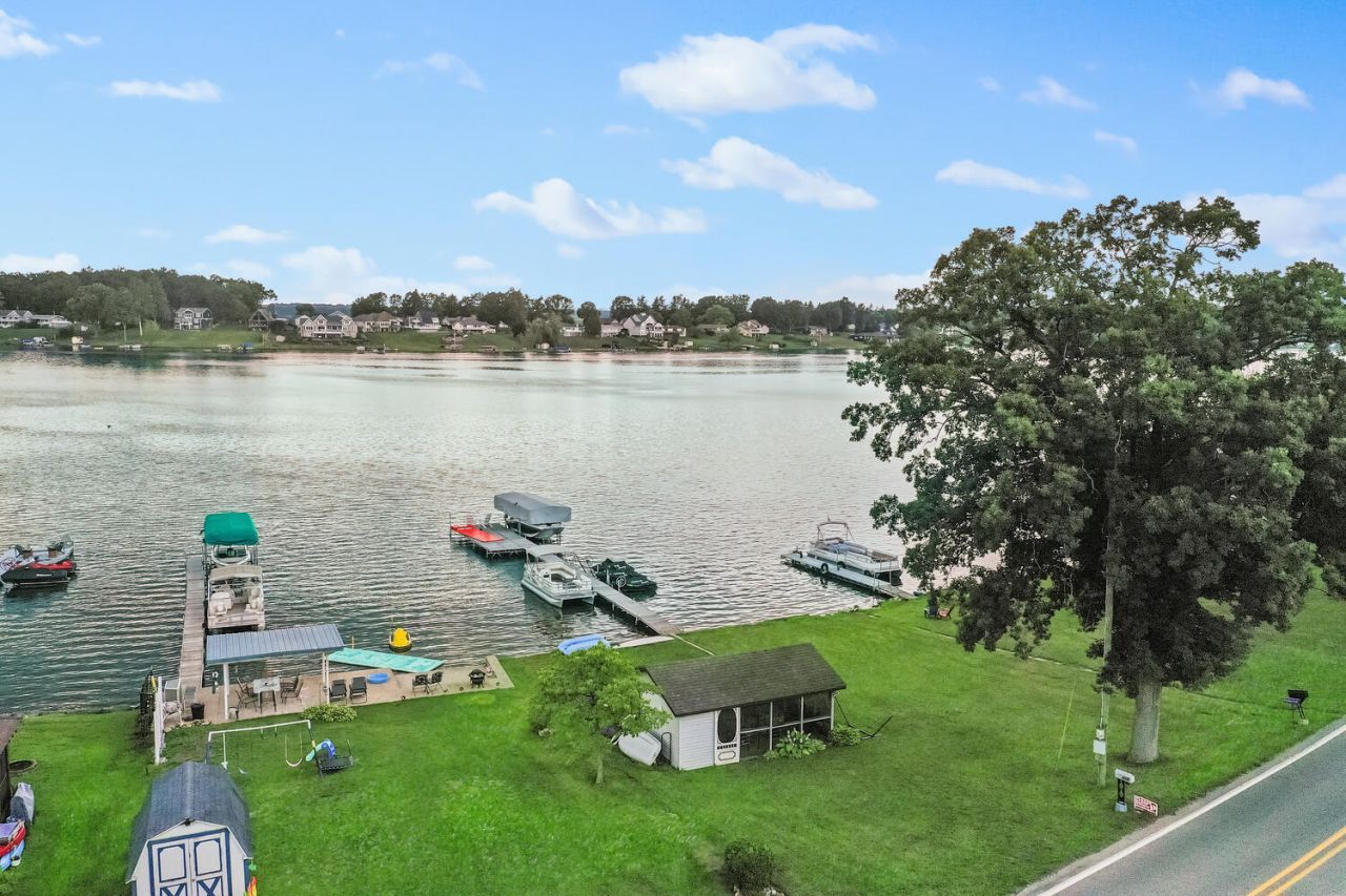 This charming five-bedroom, two-bath and thoroughly updated home on aquarter-acre lot has spectacular views of Baldwin Lake from a waterside screened pavilion, a large deck with elegantlandscaping, and an open-concept living area with newer double sliding glass doors. It has abundant sleeping space, including a large heated and cooled bunk room with full bath next to an oversized garage stall, and a fenced yard with a patio. The open area includes a living area with deck access, a dining area and kitchen with an island and new stainless appliances. The house has five bedrooms, two baths and laundry. Improvements in recent years include an updated kitchen, new baths, new HVAC, new roof, and newer engineered wood floors. The property includes a seawall, and waterside fire pit. Some furniture and furnishings are available separately. All-sports 266-acre Baldwin Lake is less than two hours from Chicago, a half-hour from Notre Dame.