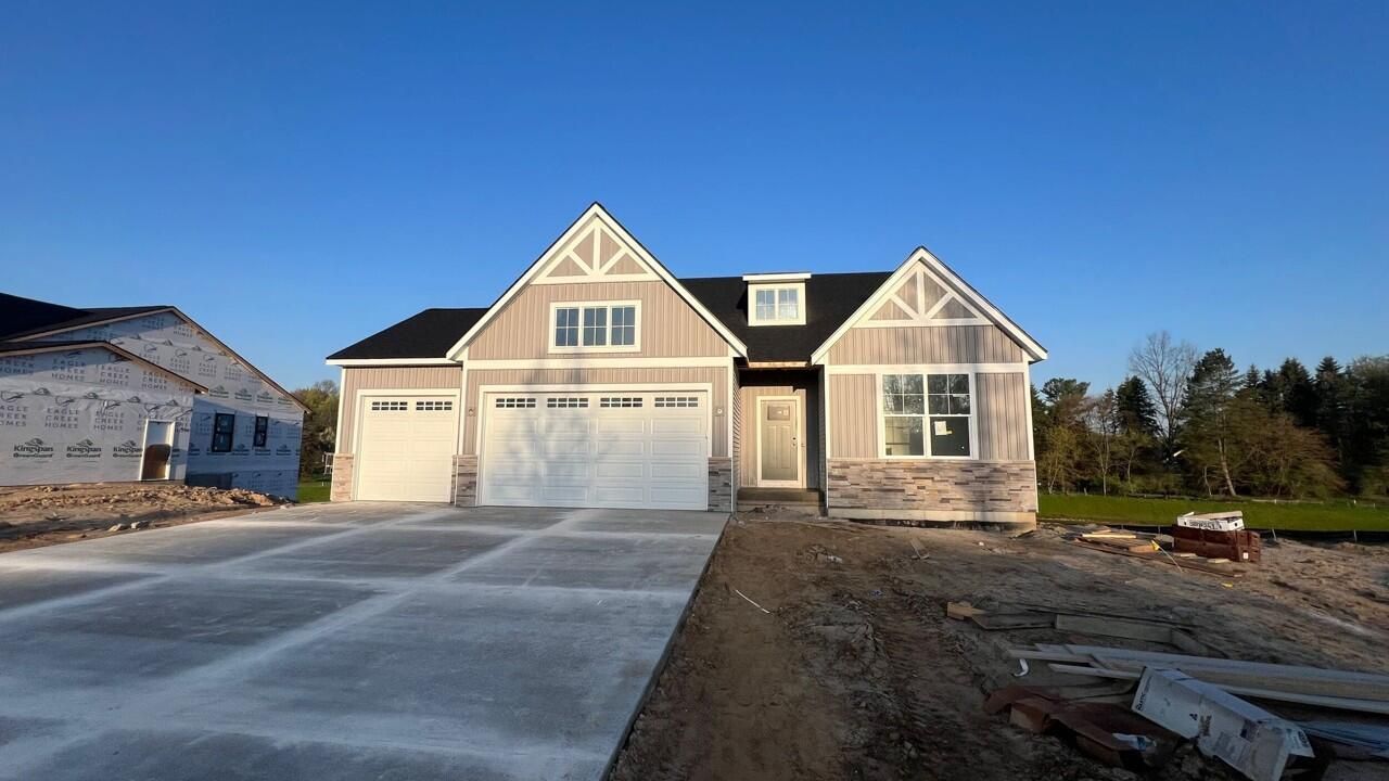 Welcome to The Meg, a beautifully crafted 1,737 sq. ft. ranch offering timeless style, thoughtful design, and room to grow. This 3-bedroom home features cathedral ceilings, elegant open railing details, fireplace and abundant natural light that fills the home with warmth and charm.The open-concept living space showcases quartz countertops, soft-close cabinetry, and refined finishes throughout. The main floor laundry room includes a utility sink and connects directly to the primary suite closet for everyday convenience.The unfinished walkout basement provides exceptional potential for 1-2 additional bedrooms, a full bath, and a spacious rec room. Located in Byron Center Blue Ribbon Schools, near Whistlestop Park, Kent Trails, shopping, and M-6. Available early June!