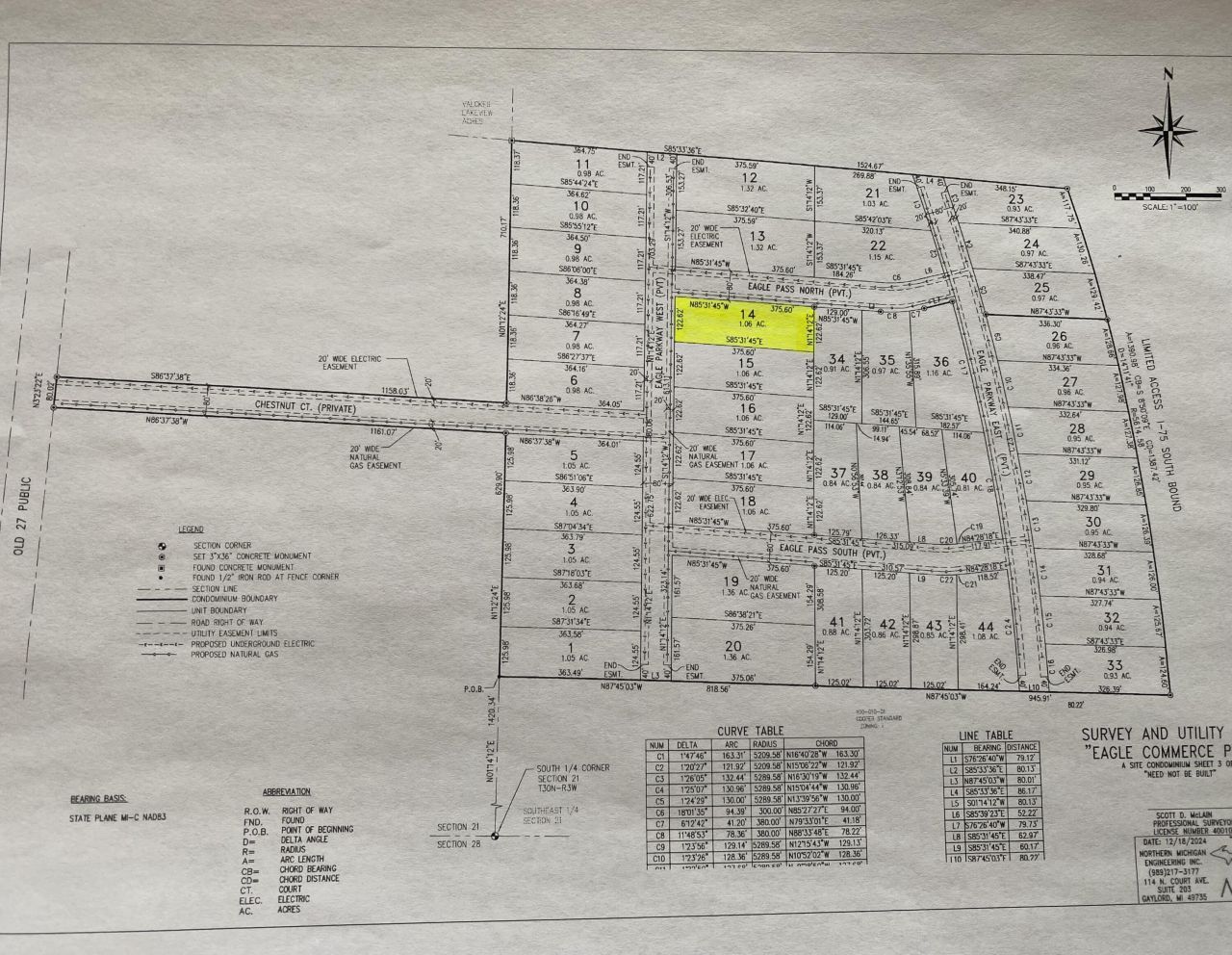 Capitalize on location and expand or start your business in Gaylords newest B-3 zoned Industrial Park. Locally owned and developed, Eagle Commerce Park features multiple lots with natural gas, Class-A roads, fiber optic internet, and 3-phase electrical service all just 1 mile from I-75 access. Lot 14 is corner lot with 1.06 acres and developer is offering build to suit options. With multiple projects completed recently, you do not want to miss out on this opportunity to grow with Gaylord! Call today for additional details and to arrange a tour!